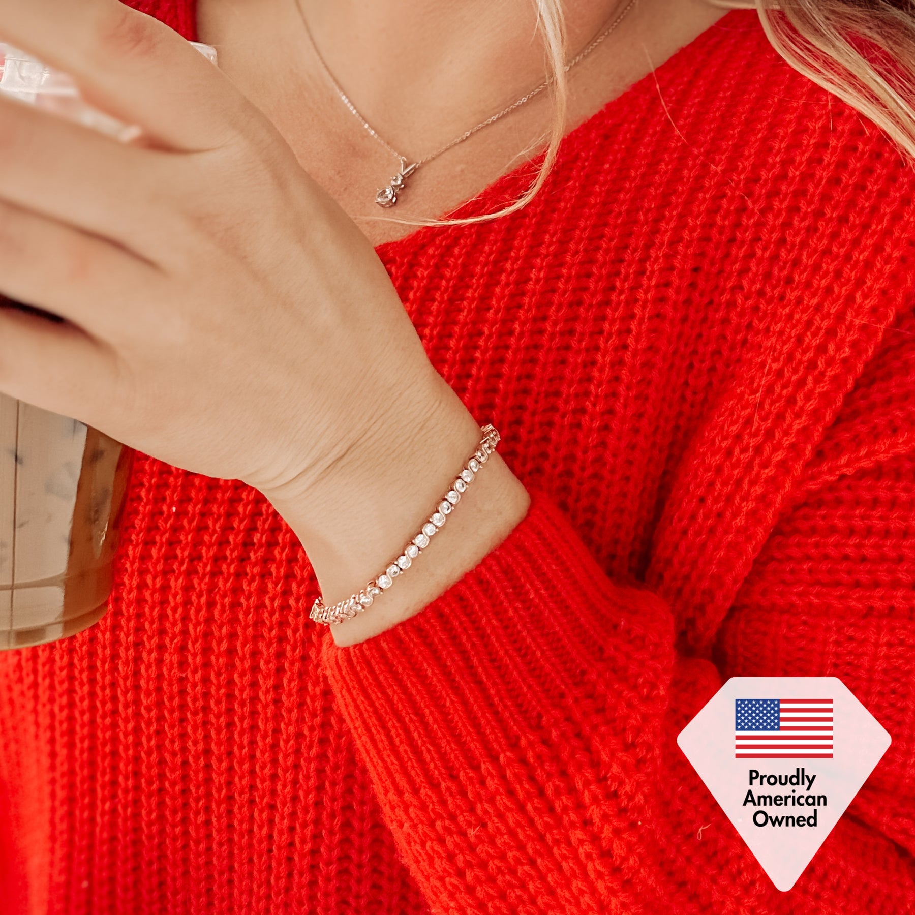VIP Jewelry Subscription Box Cate & Chloe jewelry box with tennis bracelet, necklace, and earrings on pink background