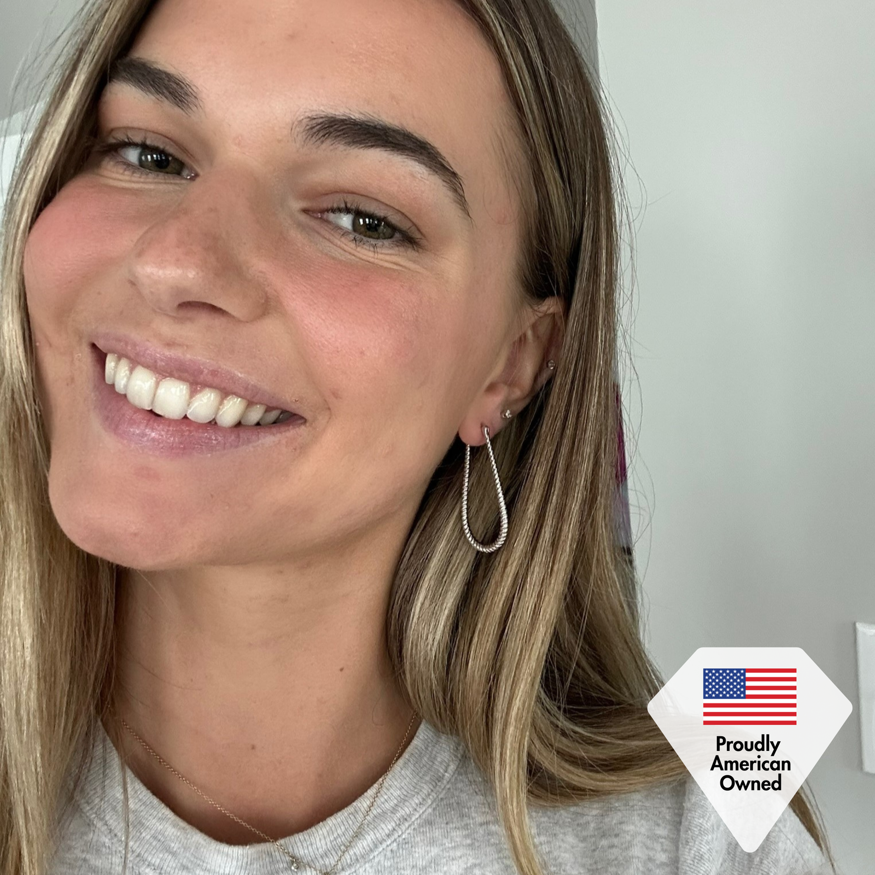 Elevate your everyday style with the Angelica 18K White Gold Plated 24mm Twisted U-Shaped Hoop Earrings from Cate & Chloe Jewelry. Featuring a modern twisted design and luminous 18K white gold plating, these lightweight hoops transition effortlessly from the office to evening events. Perfect for yourself or as a gift, Angelica earrings add timeless elegance to any collection.