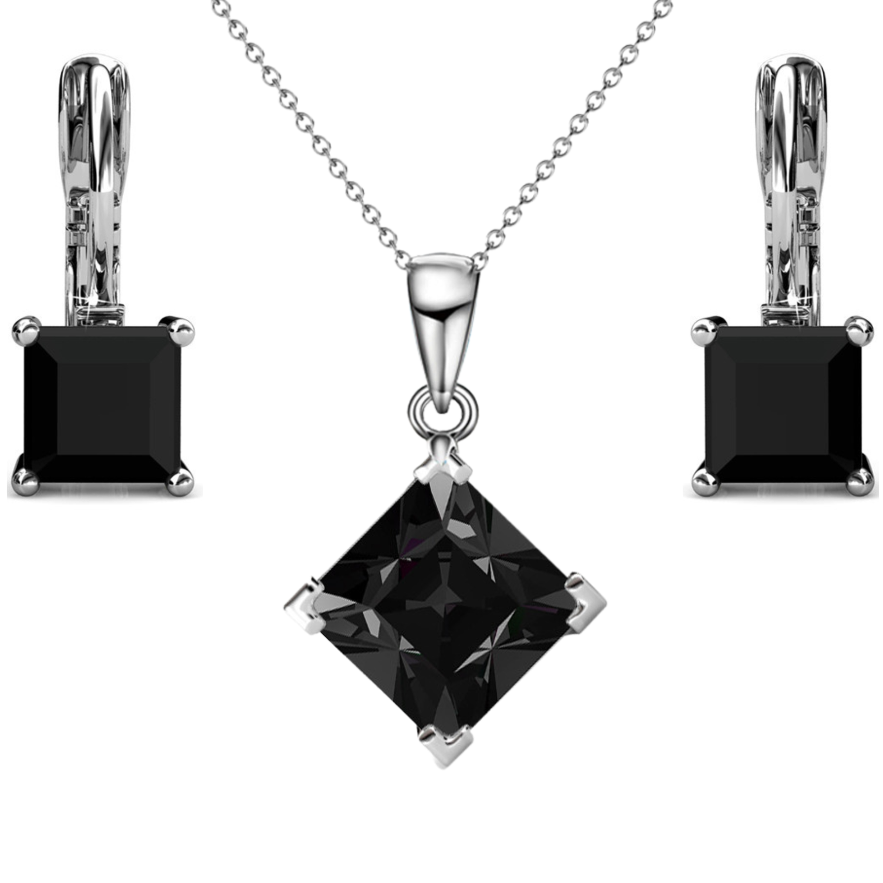 Featuring a mesmerizing 6mm flawless black crystal, expertly cut in a princess shape. This stunning solitaire jewelry set is meticulously crafted with precision and care, boasting a luxurious 18k white gold plating that glistens with every movement.