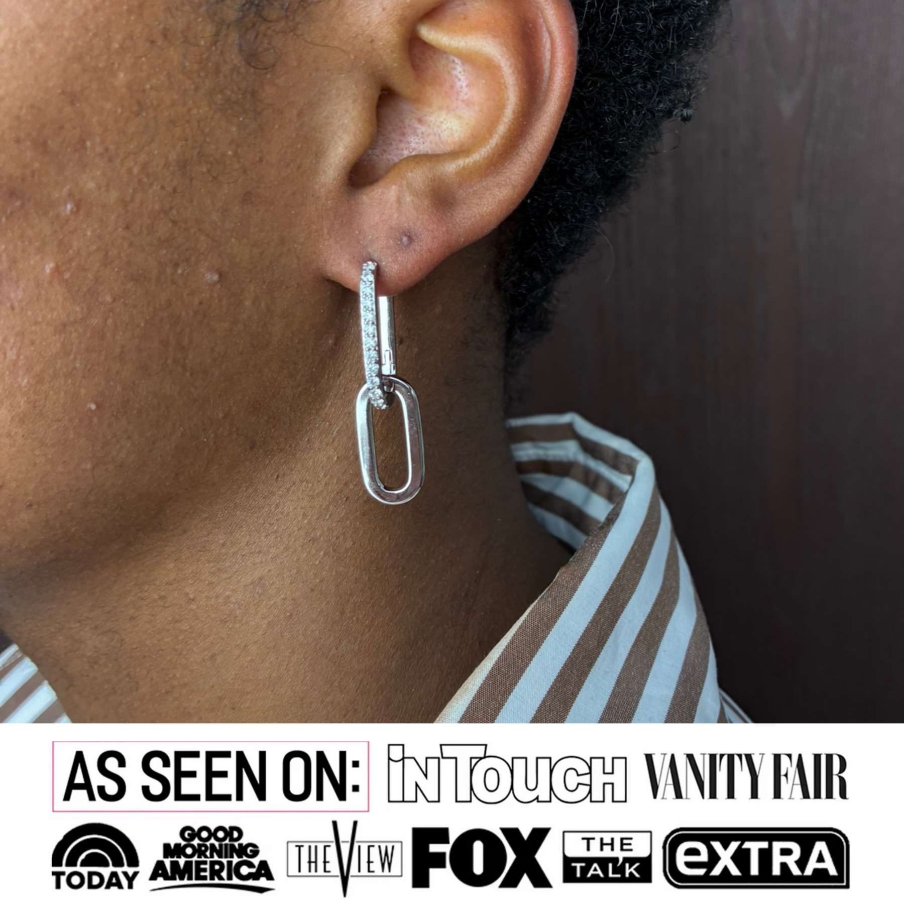 Shine with the Remington 18K White Gold Plated Dangle Chain Link Earrings with Swarovski Crystals. Lightweight and elegant, these statement earrings pair sparkling crystals with a modern chain link design, perfect for office, casual, or evening wear. Ideal for gifting or adding timeless style to your collection.