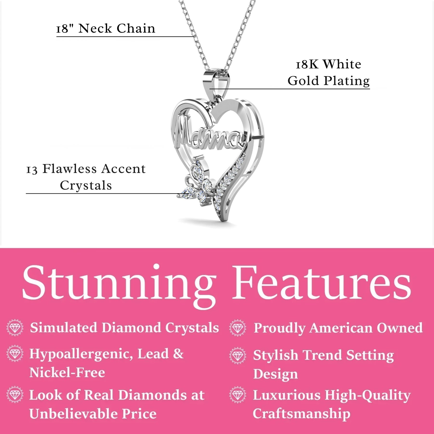 Mavis 18k White Gold Plated Mama Heart Pendant Necklace with Simulated Diamond Crystals