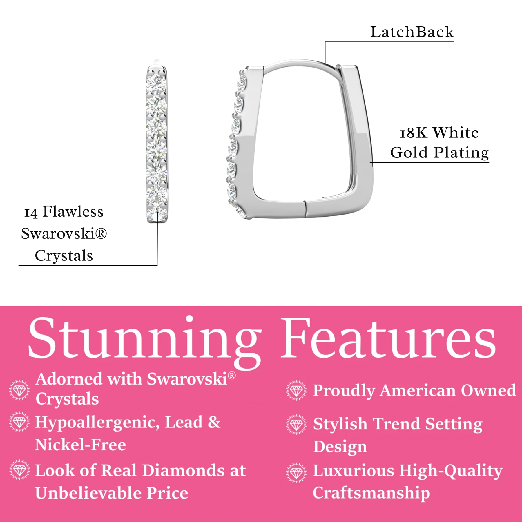 Crafted with 18k white gold plating, these hoop earrings radiate a lustrous allure that complements any attire. These stunning silver earrings dazzle with 14 round-cut Swarovski crystals, exuding brilliance and grace and creating a breathtaking ensemble of shimmer and sparkle.