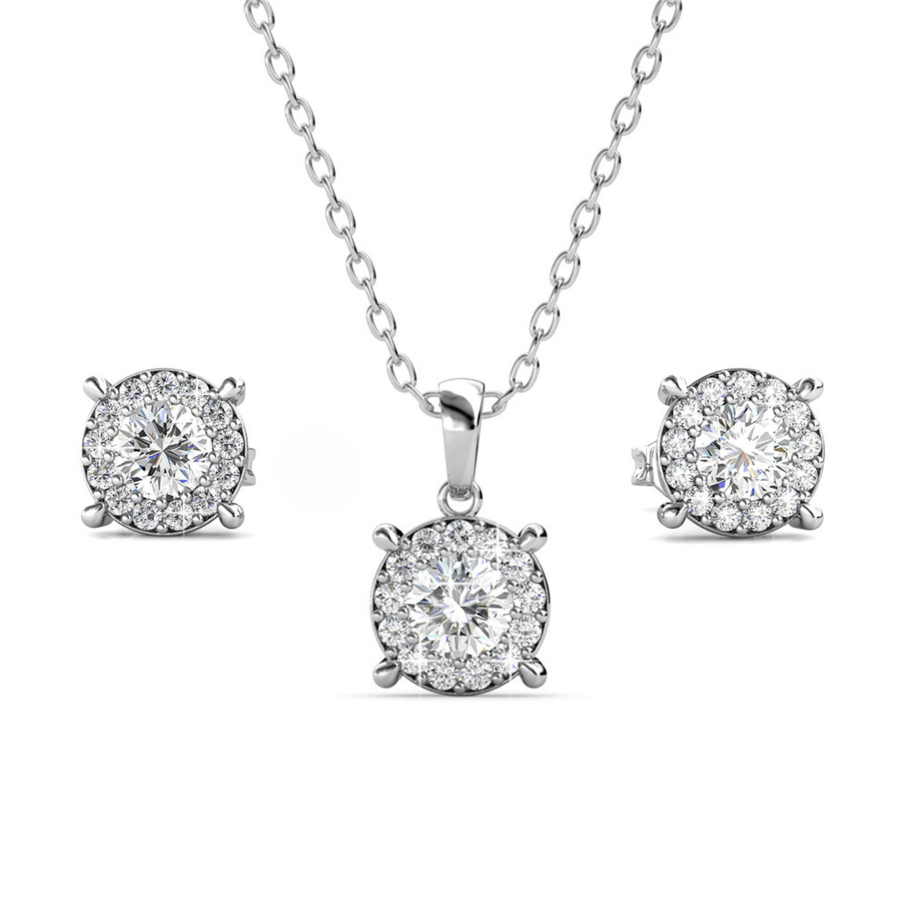 Raylee 18k White Gold Plated Halo Necklace and Stud Earrings Jewelry Set with Swarovski Crystals